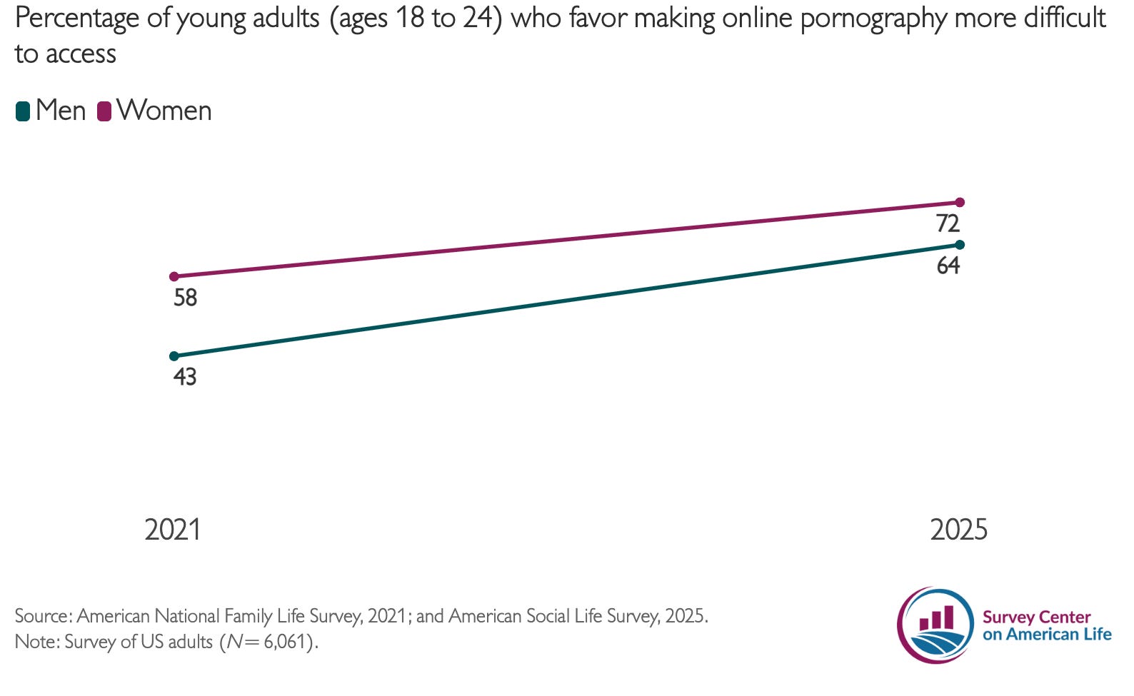 Over the last four years, the percentage of young men who favor making online pornography more difficult to access has risen from 43% to 64%, a clear shift toward tighter restrictions. Age-verification laws offer a template for minors, but would there be support for friction-increasing policies?