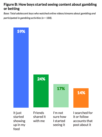 Common Sense Media’s new report finds that 36% of boys age 11-17 have gambled in the past year, with the highest among 17-year-olds (49%). Of those who gamble, the majority (59%) report that gambling-related content “just started showing up” in their feeds—suggesting that algorithms are driving discovery.