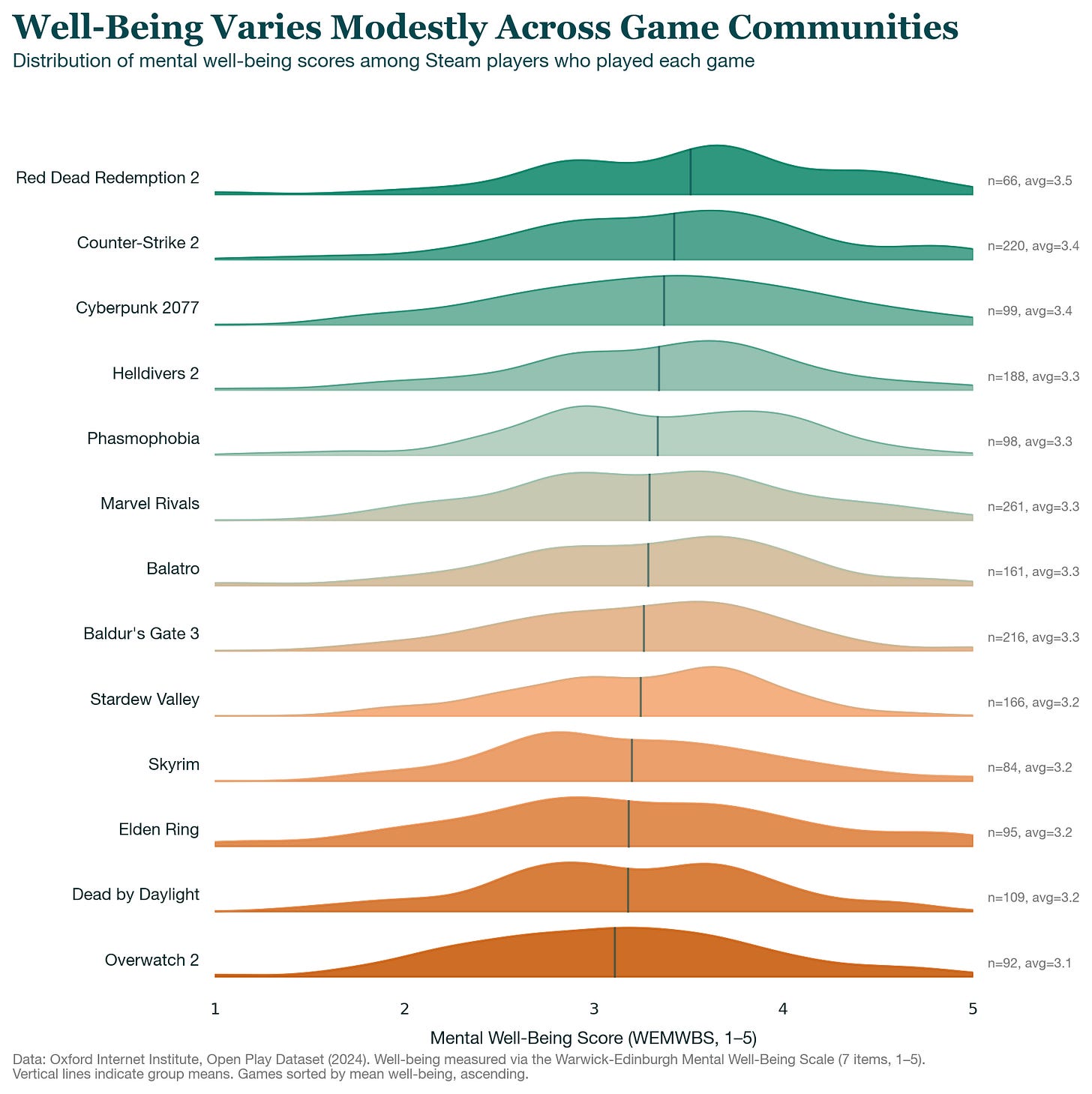 I downloaded the dataset, threw it into Claude Code, and spent half an hour playing around. Here’s one finding: Overwatch 2 players have the lowest average well-being of any major game in the dataset. (If you’ve played Overwatch, you will not be surprised.)